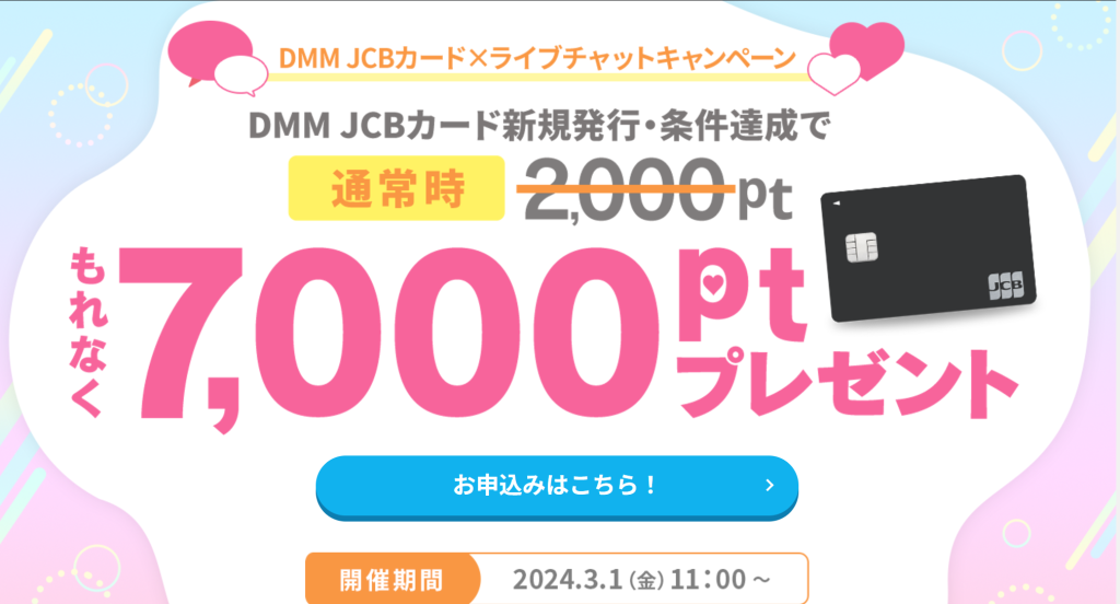 矢印の上の画面をクリックすると同ブログの記事に飛びます。DMMでDMM JCBカードを作ると、DMMポイント2000ポイント、ライブチャットで使う専門のポイントが5000ポイントもらえる。
