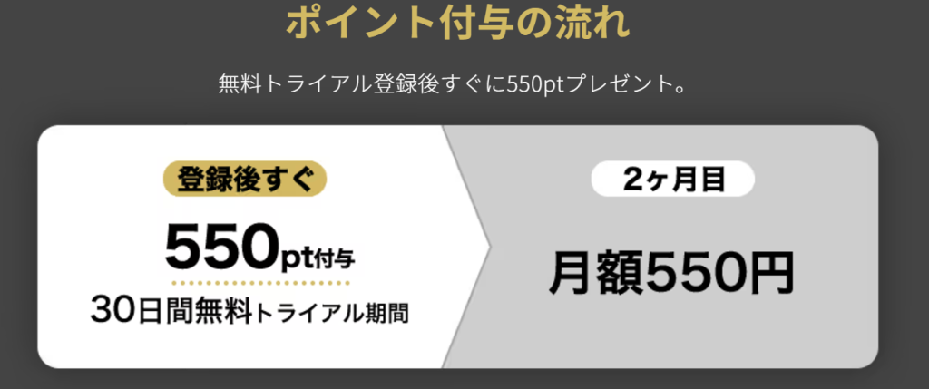 30日間無料トライアルがあり、初回550ポイントもらえるので、実質2か月無料みたいなもんだ。