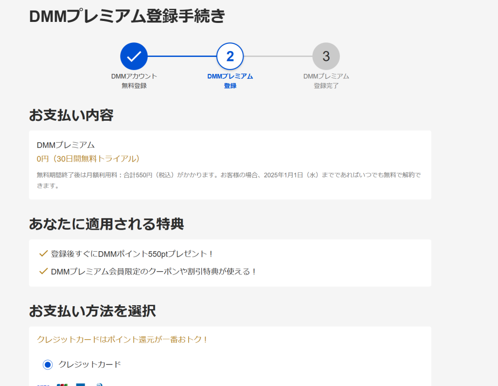 ここでクレジットカードの登録になる。なので、先に無料のDMM会員(アカウントがあるだけ)になってクレジットカードの登録になる。