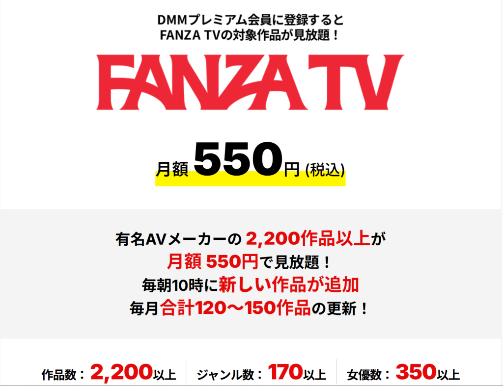 FANZA TVだと月額550円でいろいろな作品がみれる。お気に入りの女優さん、監督さんを見つけるのにもってこい。見つくしたら(見つくせるんだろうか?)契約を切れば、月額料金ははっせいしない。